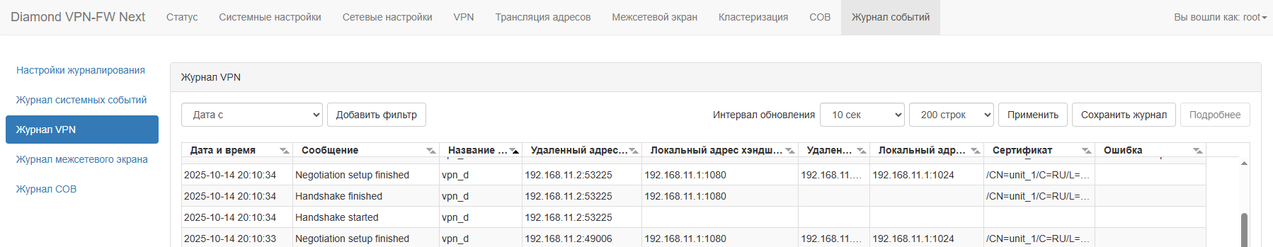 На устройстве СКЗИ «Dcrypt XG» в журнале VPN ведется учет всех событий, которые были зафиксированы подсистемой построения защищенных соединений. Для просмотра журнала необходимо в главном меню выбрать пункт «Журнал событий – Журнал VPN». В таблице «Журнал VPN» представлены события подсистемы VPN. В журнале подробно фиксируются все события: успешные попытки подключения, ошибки при подключении, запуск и остановка сервисов.