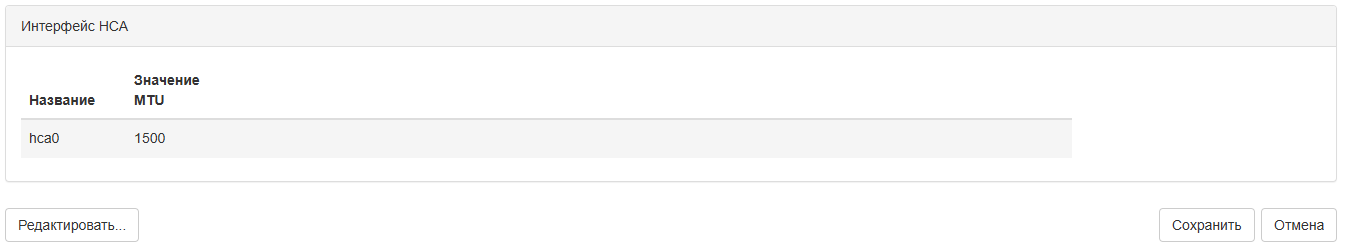 Для настройки HCA интерфейса необходимо в главном меню выбрать пункт “Сетевые настройки - Интерфейс HCA”. Для каждого криптомодуля будет доступен один интерфейс HCA. По умолчанию HCA интерфейс находится в состоянияя “Down”. Для перевода в состояние “Up” необходимо выбрать выбрать и нажать на кнопку “Редактировать”.