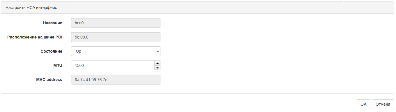 В новом окне “Настроить HCA интерфейс” в поле “Состояние” необходимо выставить значение “Up”. Для сохранения настроек необходимо нажать на кнопку “Ок” и “Сохранить”.