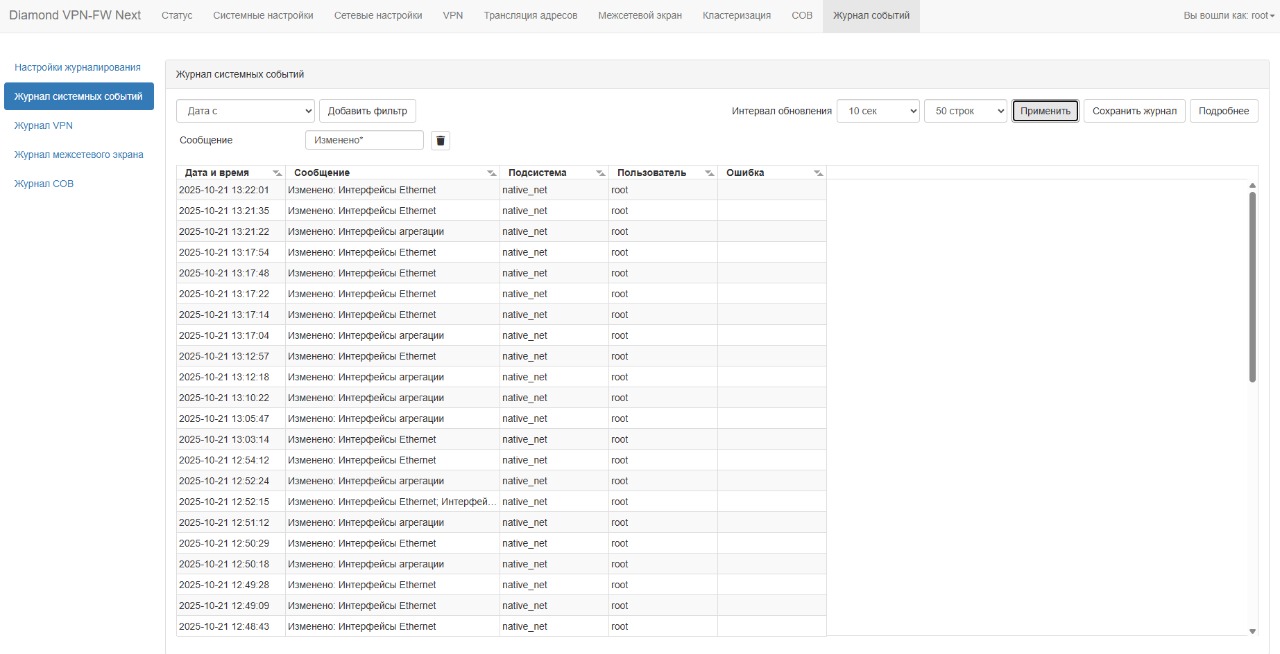 Параметр позволяет задать интервал обновления журнала системных событий. Доступные значения: 1 секунда, 5 секунд и 10 секунд. Значение по умолчанию: 10 секунд. |
