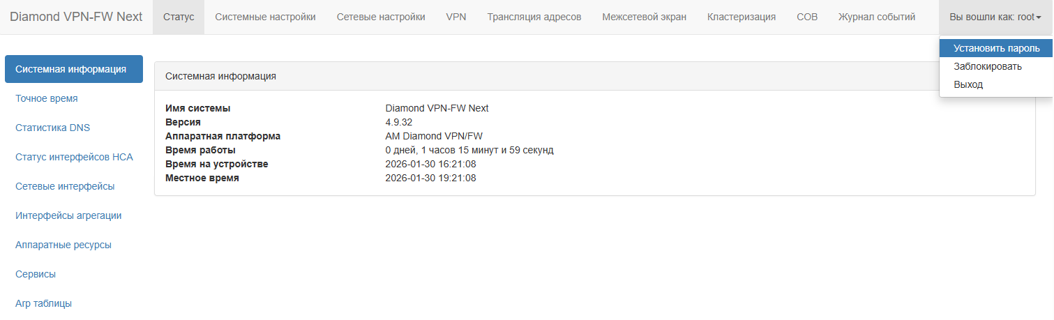 По умолчанию на устройстве “МКСЗ Diamond Next” действует стандартный пароль, который указан в документации на устройство. При необходимости пароль для учетной записи root может быть изменен.