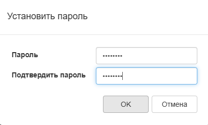 В новом окне “Установить пароль” в поле “Пароль” необходимо задать новый пароль, в поле “Подтвердить пароль” ввести пароль еще раз для подтверждения. После задания настроек необходимо нажать на кнопку “Ок”.