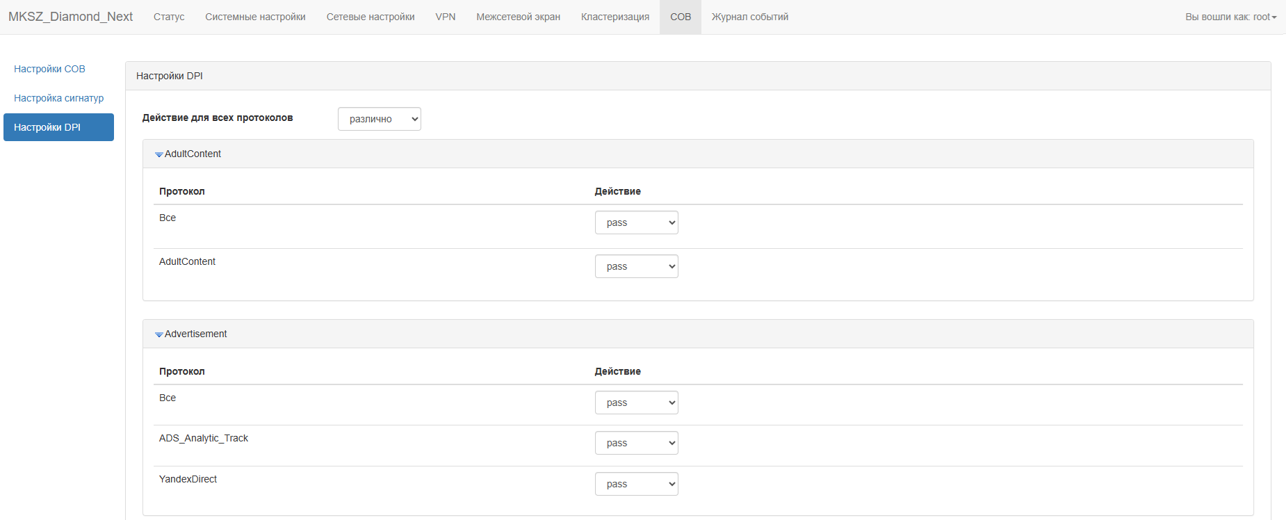Чтобы выбрать протоколы и приложения, которые необходимо пропускать, детектировать или блокировать, нужно перейти во вкладку «СОВ» - «Настройки DPI». В списке будут представлены протоколы, разделенные на группы, и действия, для протоколов. Можно выбирать действия для всех приложений, для отдельной группы или для отдельного приложения.