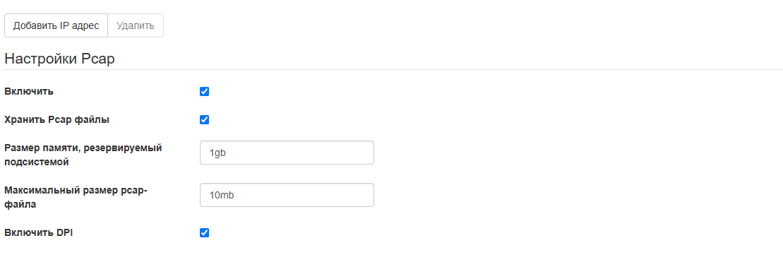 Для работы системы DPI необходимо поставить флаги в следующих полях: «Настройки Pcap» - «Включить» и «Хранить Pcap файлы» . В поле «Размер памяти, резервируемый подсистемой» необходимо задать объем жесткого диска, который будет выделен для хранения pcap файлов. В поле «Максимальный размер pcap-файла» необходимо задать максимальный размер pcap-файла.