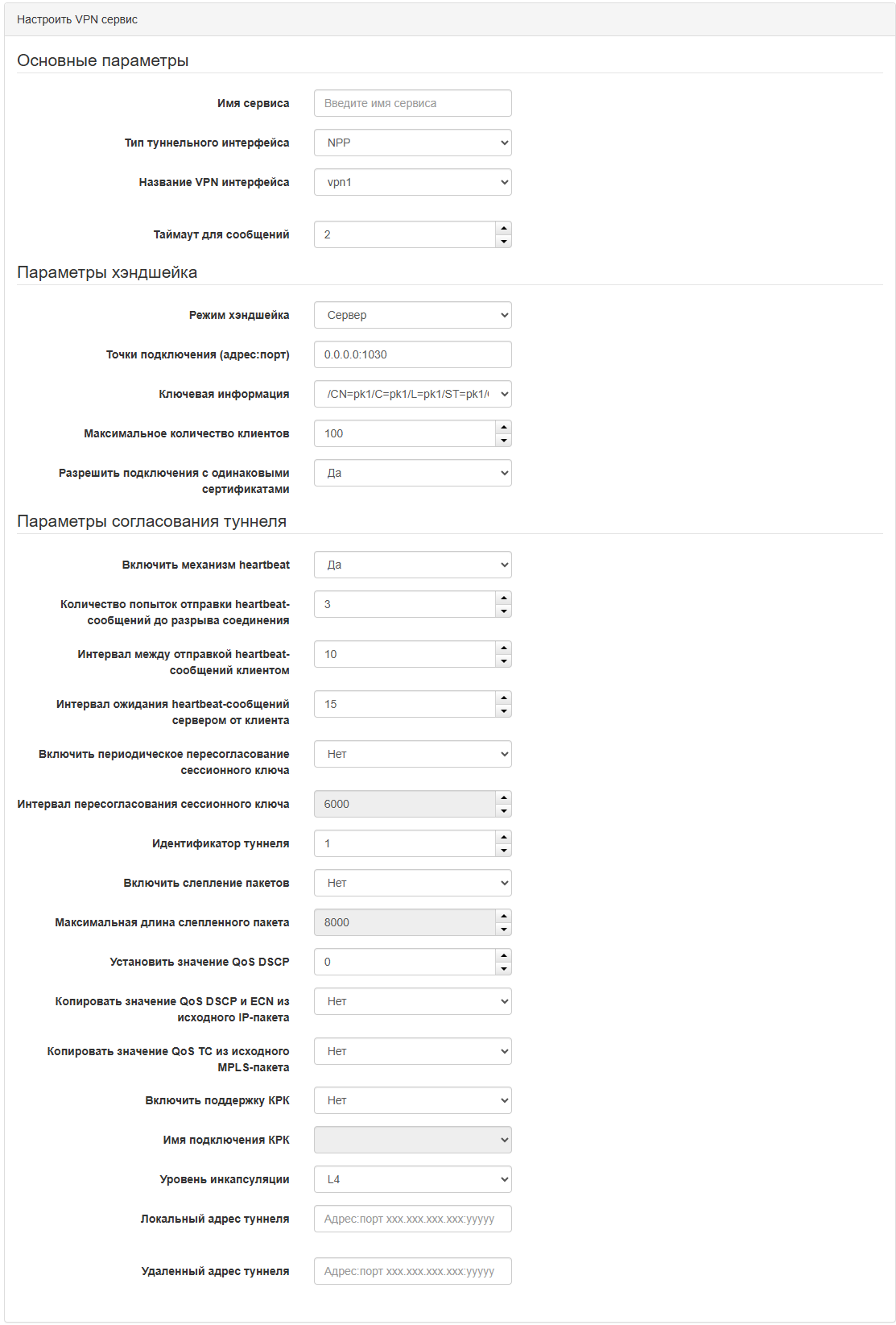 | Тип туннельного интерфейса | Тип сетевого интерфейса, через который будет работать VPN-сервис. |