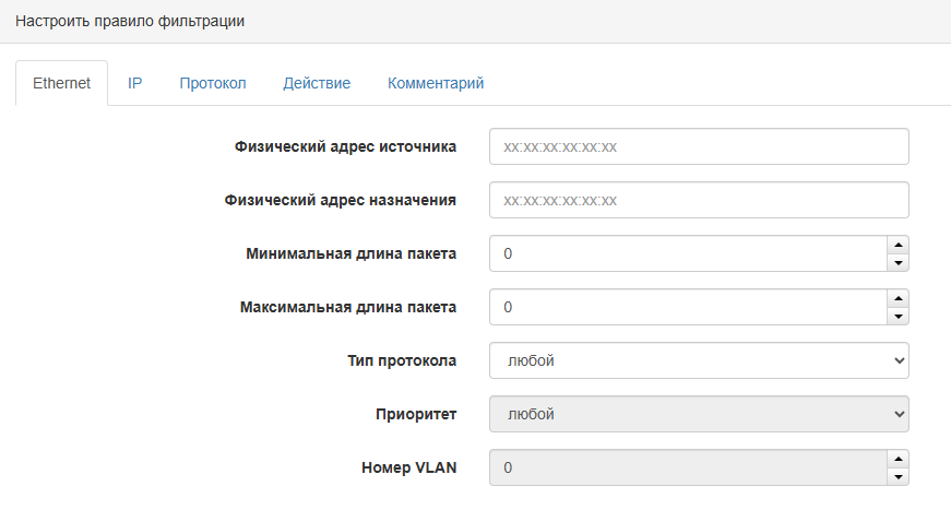 Тип протокола | Тип протокола или EtherType определяет, какой сетевой протокол (L3) или служебный механизм используется в payload фрейма. Доступны следующие варианты: ipv4, arp, ipv6, vlan, rarp, lacp, other. Значение “other" позволяет ввести значение типа в шестнадцатеричном формате. | ||