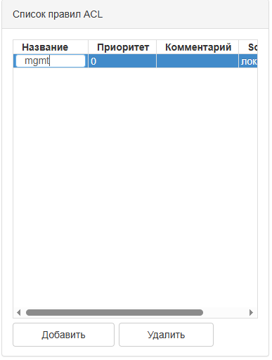 По умолчанию список доступа создается с название “ACLi”, где i - это порядковый номер списка. Для переименования списка доступа необходимо дважды нажать на его название, в появившемся поле ввести новое название и нажать клавишу «Enter».