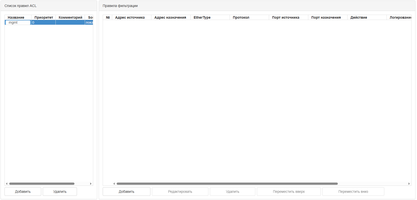 Правила фильтрации в списке доступа выполняются в порядке следования сверху вниз. При помощи кнопки “Переместить вверх” и “Переместить вниз” можно изменить позицию правила фильтрации в общем списке. После изменения позиции необходимо сохранить изменения.