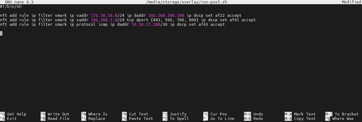 Чтобы сохранить настройки с правилами маркировки сетевого трафика необходимо перенести их в инициализирующий файл «run-post.sh», который будет автоматически выполняться при каждом запуске устройства. Файл находится в папке «/media/storage/overlay/». Чтобы перейти в папку «/media/storage/overlay» необходимо выполнить команду «cd /media/storage/overlay/» .