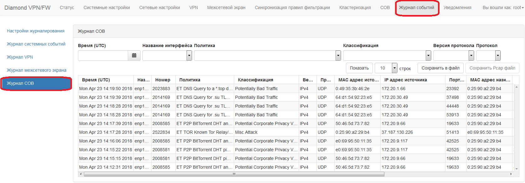 Для просмотра журнала системы обнаружения вторжений необходимо в главном меню выбрать пункт «Журнал событий – Журнал СОВ». В таблице «Журнал СОВ» представлены события системы обнаружения вторжений. В поле «Время (UTC)» необходимо задать дату и время для просмотра событий в журнале. Если дата и время не заданы, то для просмотра будет доступен весь журнал событий. В поле «Название интерфейса» необходимо задать сетевой интерфейс. В поле «Политика» необходимо задать политику системы обнаружения вторжений. В поле «Классификация» необходимо задать классификацию системы обнаружения вторжений. В поле «Версия протокола» необходимо задать версию протокола. В поле «Протокол» необходимо выбрать протокол TCP или UDP.