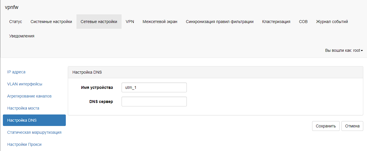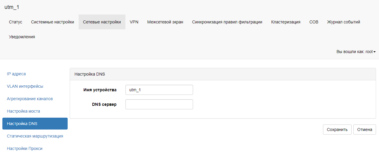 Для задания имени устройства необходимо в главном меню выбрать пункт «Сетевые настройки – Настройка DNS». В таблице «Настройка DNS» в поле «Имя устройства» необходимо задать имя устройства. Для сохранения настроек необходимо нажать на кнопку «Сохранить».