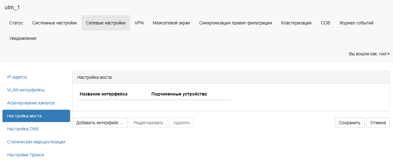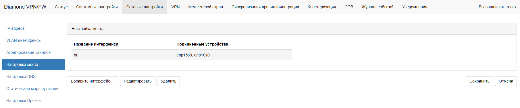 Для редактирования сетевого интерфейса в режиме Bridge необходимо выбрать строку с сетевым интерфейсом, который необходимо редактировать, и нажать на кнопку «Редактировать». Для удаления сетевого интерфейса в режиме Bridge необходимо выбрать строку с сетевым интерфейсом, который необходимо удалить, и нажать на кнопку «Удалить». Для сохранения настроек необходимо нажать на кнопку «Сохранить».
