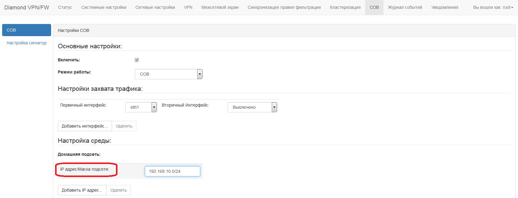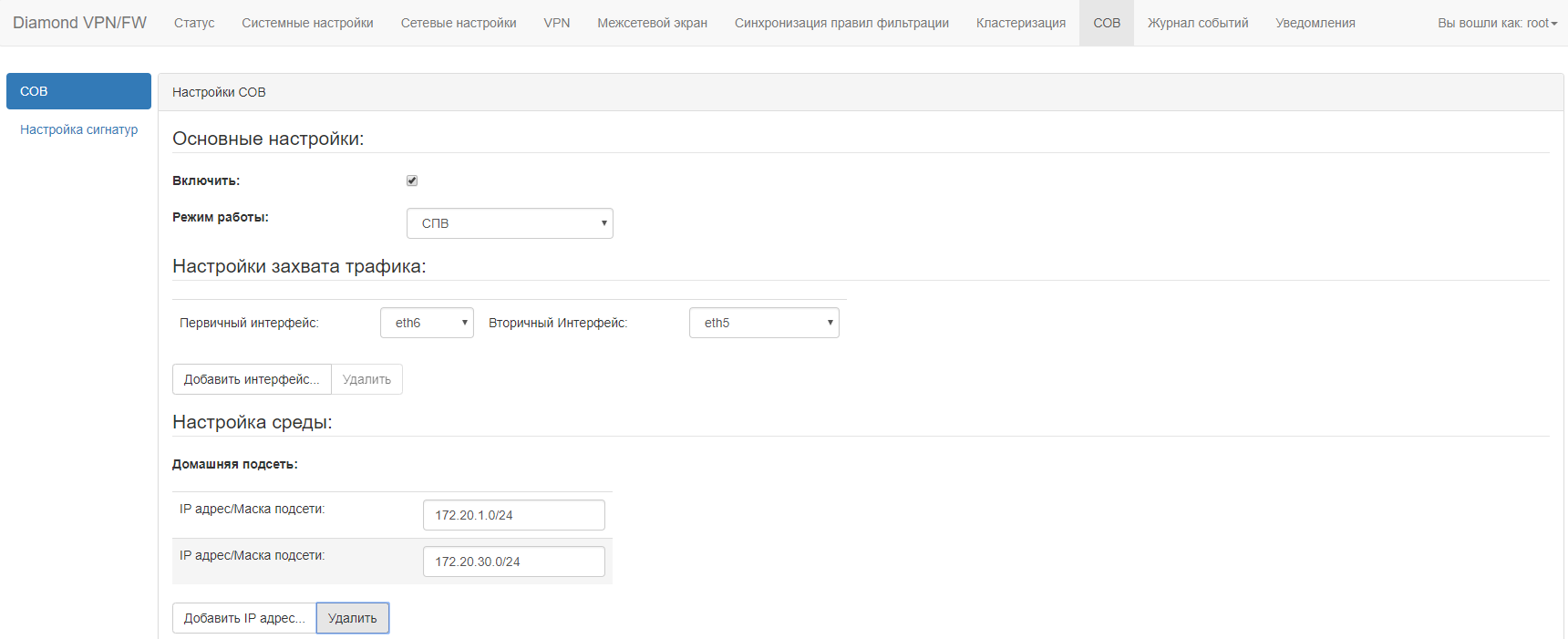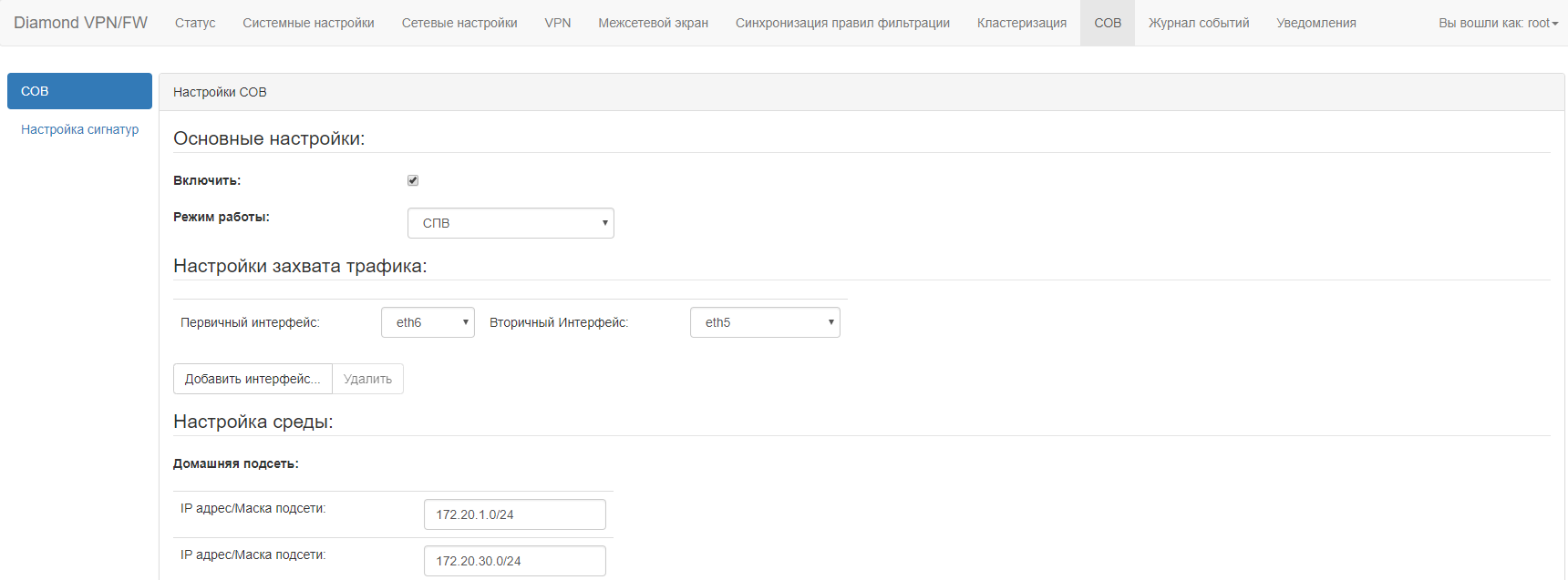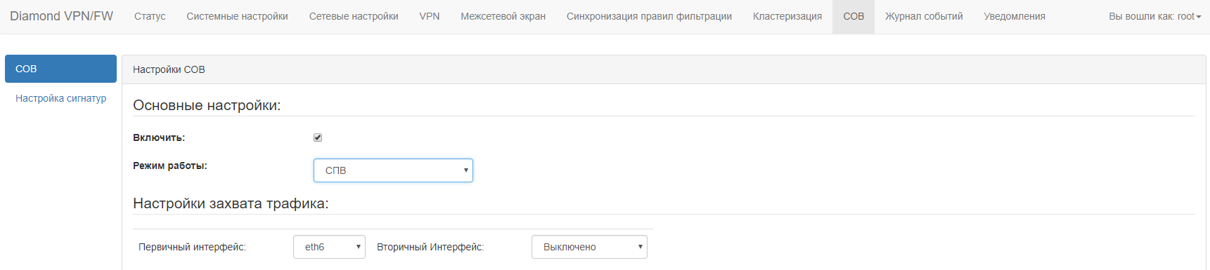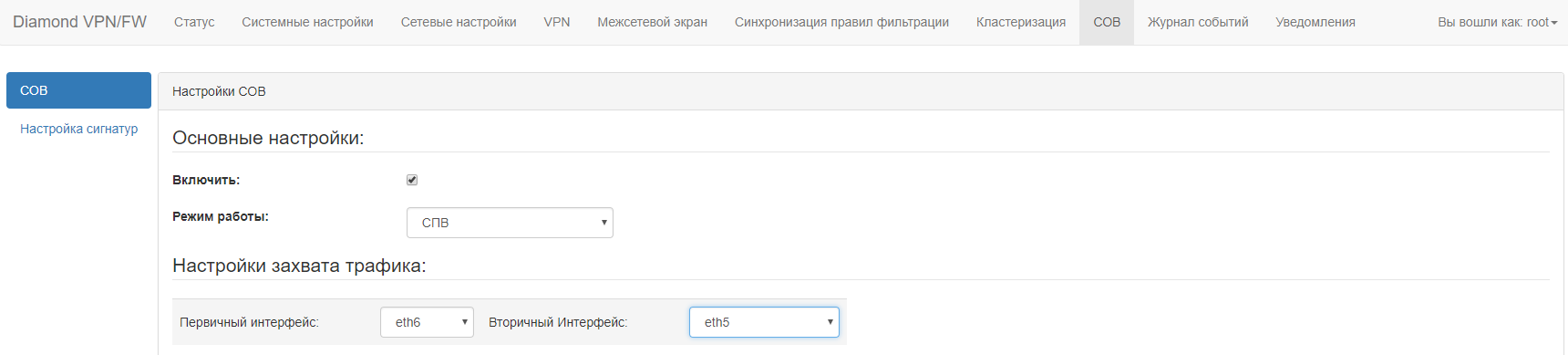 Для настройки системы обнаружения вторжений необходимо в главном меню выбрать пункт «СОВ – СОВ». Флаг «Включить» должен быть установлен. В поле «Режим работы» необходимо выбрать один из режимов работы. В поле «Первичный интерфейс» необходимо выбрать один из сетевых интерфейсов, на котором устройство будет захватывать сетевой трафик для анализа. В поле «вторичный интерфейс» необходимо выбрать один из сетевых интерфейсов, на который необходимо отправить сетевой трафик после анализа. Если устройству требуется только анализ сетевого трафика и не требуется его перенаправлять дальше, то в поле «Вторичный интерфейс» необходимо установить значение «Выключено».