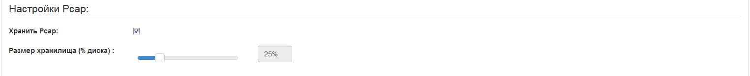 Для сохранения на жесткий диск файлов в формате pcap с сетевой активностью, которая была детектирована в сетевом трафике, необходимо в настройках системы обнаружения вторжения установить флаг «Хранить pcap». В поле «Размер хранилища (% диска)» необходимо задать объем жесткого диска, который будет выделен для хранения pcap файлов. При достижении этого разрешенного объема будет происходить процесс ротации. В процессе ротации старые записи будут удаляться и заменяться новыми.