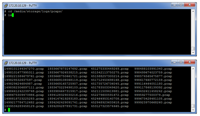 Для сохранения настроек необходимо нажать на кнопку «Сохранить». Файлы pcap с сетевой активностью сохраняются в папку /media/storage/logs/pcap/. Для просмотра файлов необходимо подключиться к устройству по протоколу ssh и перейти в папку с помощью команды «cd /media/storage/logs/pcap/». Для просмотра файлов в папке необходимо выполнить команду «ls».