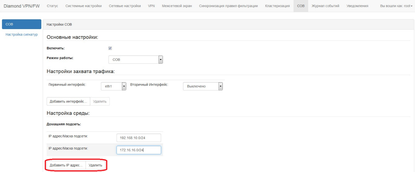 Для сохранения настроек необходимо нажать на кнопку «Сохранить». Если необходимо удалить сетевой интерфейс, на котором происходит анализ сетевого трафика, необходимо выбрать сетевой интерфейс и нажать на кнопку «Удалить». В поле «IP адрес/Маска подсети» необходимо задать ip-адрес и маску подсети для домашнего сегмента сети.