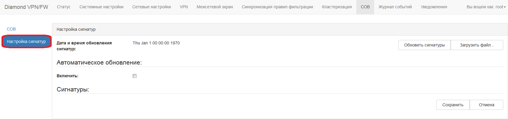 Для настройки обновления системы обнаружения вторжений необходимо в главном меню выбрать пункт «СОВ – Настройка сигнатур».