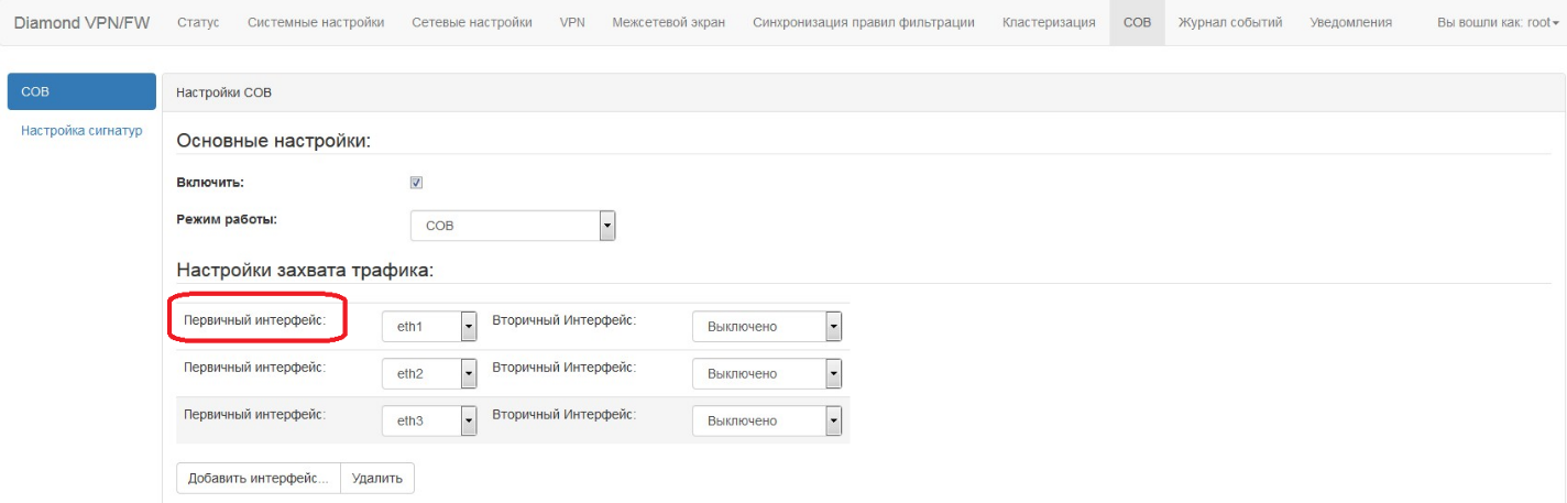 Система обнаружения вторжений позволяет прослушивать одновременно несколько сетевых интерфейсов. Для добавления дополнительного сетевого интерфейса, на котором будет происходить анализ сетевого трафика, необходимо нажать на кнопку «Добавить интерфейс». В поле «Первичный интерфейс» необходимо выбрать один из сетевых интерфейсов, на котором устройство будет захватывать сетевой трафик для анализа. В поле «вторичный интерфейс» необходимо выбрать один из сетевых интерфейсов, на который необходимо отправить сетевой трафик после анализа. Если устройству требуется только анализ сетевого трафика и не требуется его перенаправлять дальше, то в поле «Вторичный интерфейс» необходимо установить значение «Выключено».