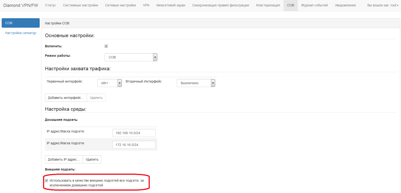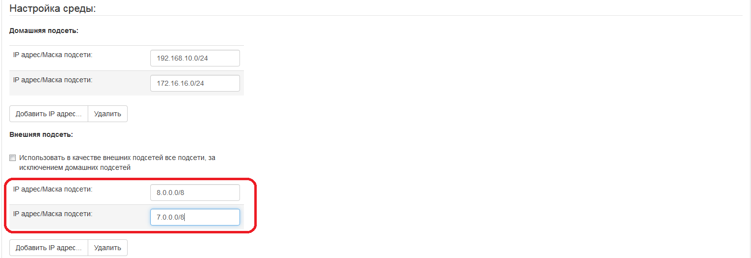 Система предотвращения вторжений построена на основе того, что у нас существует два сегмента сети: внешний сегмент сети и домашний сегмент сети. По умолчанию установлен флаг «Использовать в качестве домашних подсетей все подсети, за исключением домашних подсетей». Если необходимо добавить конкретные внешние подсети, то необходимо снять этот флаг и в поле «IP адрес/Маска подсети» задать ip-адрес и маску подсети для внешнего сегмента сети. Для сохранения настроек необходимо нажать на кнопку «Сохранить».