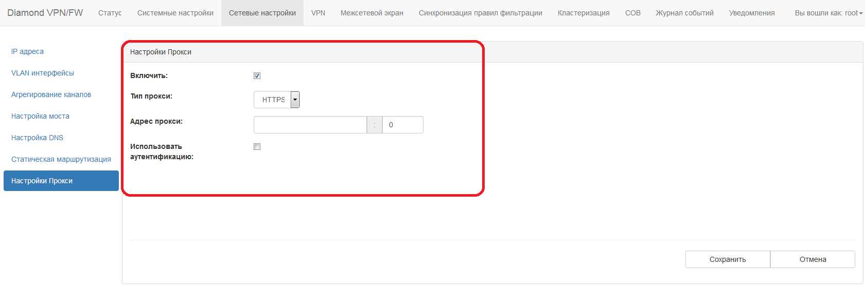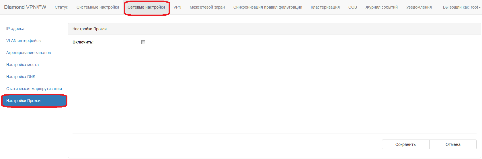 Для обновления системы обнаружения вторжений через прокси сервер необходимо осуществить настройку прокси сервера. Для настройки прокси сервера необходимо в главном меню выбрать пункт «Сетевые настройки – Настройки Прокси». В таблице «Настройки Прокси» необходимо установить флаг «Включить».