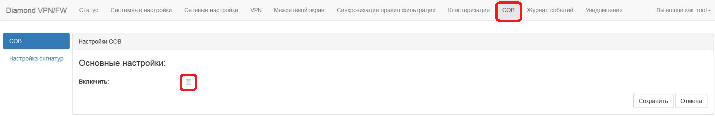 Для включения системы обнаружения вторжений необходимо в главном меню выбрать пункт «СОВ – СОВ» и установить флаг «Включить». Для сохранения настроек необходимо нажать на кнопку «Сохранить».