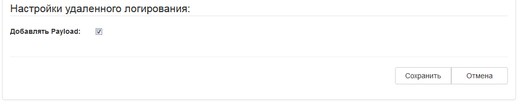 Для отправки сокращенного сообщения на удаленный сервер, которое не включает значение поля payload и сетевого пакета необходимо убрать флаг «Добавить Payload». Для сохранения настроек необходимо нажать на кнопку «Сохранить».