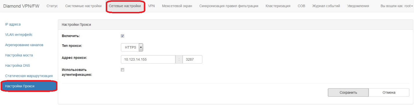 Для настройки прокси сервера на устройстве необходимо в главном меню выбрать пункт «Сетевые настройки – Настройки прокси» (изобр. 6.l.1). В таблице «Настройки прокси» необходимо установить флаг «Включить». В поле «Тип прокси» необходимо выбрать тип прокси-сервера, в поле «Адрес прокси» необходимо задать ip-адрес и сетевой порт.