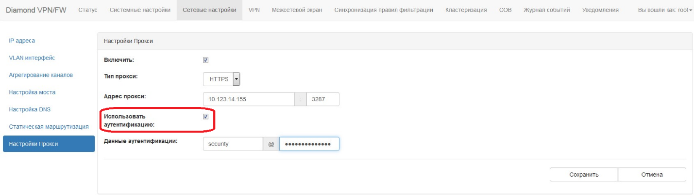 Для использования аутентификации необходимо установить флаг «Использовать аутентификацию». В поле «Данные аутентификации» необходимо задать имя пользователя и пароль. Для сохранения настроек необходимо нажать на кнопку «Сохранить».
