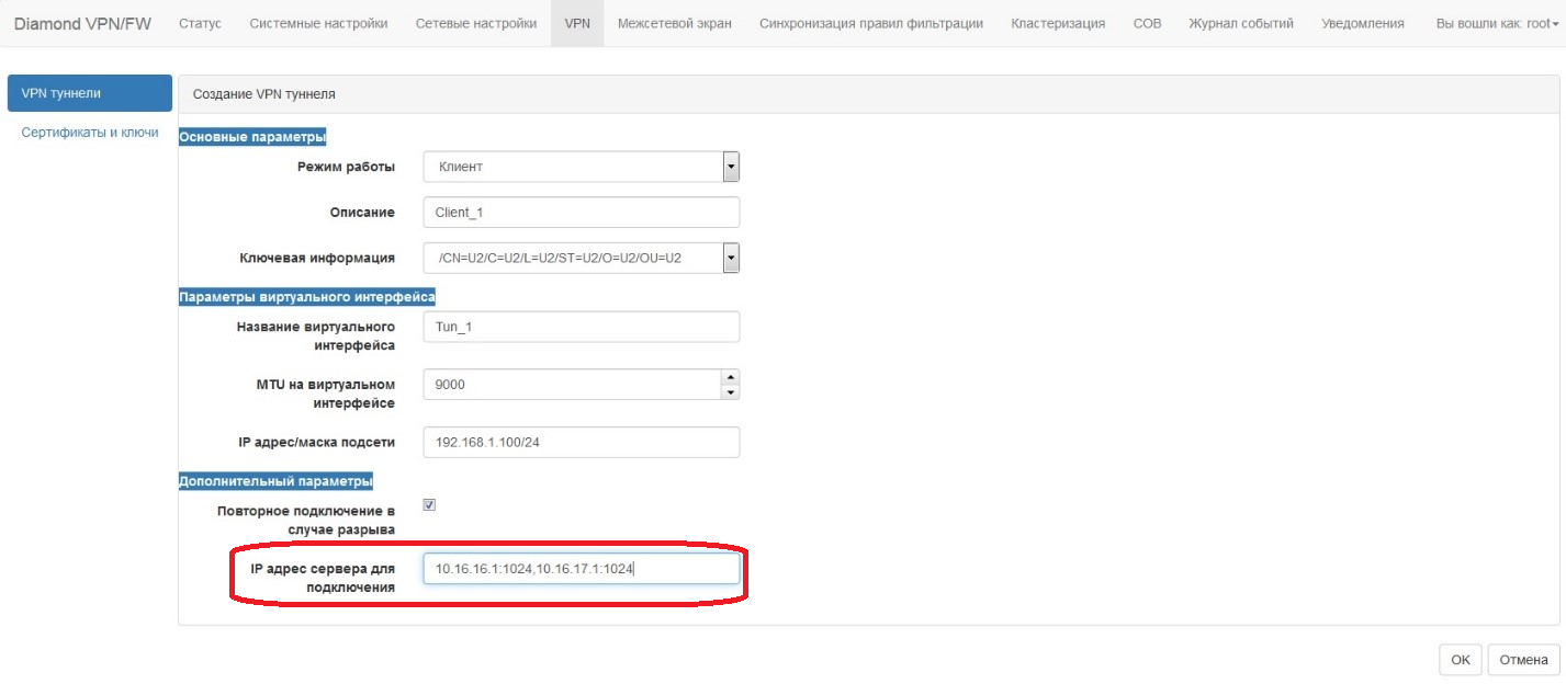 Устройство МКСЗ «Diamond VPN/FW» будет подключаться к каждому серверу по очереди. Например, «10.16.16.1:1024, 10.16.17.1:1024» где «10.16.16.1» – это ip-адрес основного удаленного сервера, «10.16.17.1» – это ip-адрес резервного удаленного сервера, а 1024 сетевой порт для подключения. Переключение на резервный сервер происходит только в случае недоступности основного сервера. В случае восстановления основного сервера не происходит автоматического переключения на основное защищенное соединение. Все сетевое взаимодействие идет через резервное защищенное соединение. В случае недоступности резервного сервера происходит переключение на основной сервер. Количество резервных серверов неограниченно.