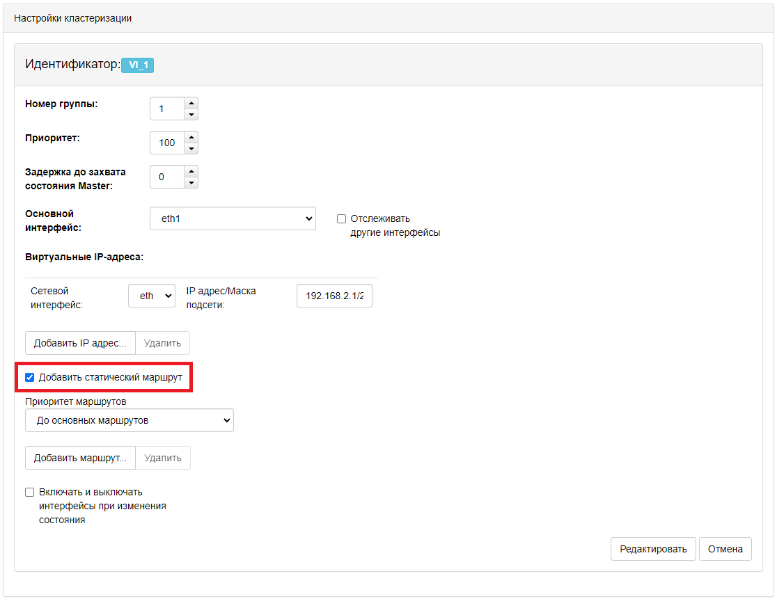 Для настройки статического маршрута, который будет применяться при переходе устройства в состояние «Master», необходимо в настройках кластера установить флаг «Добавить статический маршрут». Для добавления статического маршрута необходимо нажать на кнопку «Добавить маршрут». В поле «Адрес назначения и маска подсети» необходимо задать ip-адрес и маску подсети в формате префикса, в поле «Основной шлюз» необходимо задать ip-адрес основного шлюза.