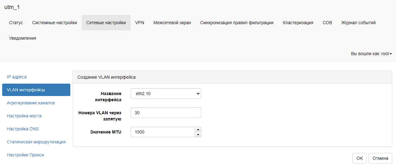 На устройстве МКСЗ Diamond VPN/FW поддерживается технология VLAN Q-in_Q (802.1ad) - возможность задания двойных меток VLAN_ID. Для настройки технологии Q-in-Q необходимо в главном меню выбрать пункт «Сетевые настройки – VLAN интерфейс». В таблице «VLAN интерфейс» необходимо нажать на кнопку «Добавить VLAN интерфейс». В поле «Название интерфейса» необходимо выбрать VLAN интерфейс, который уже имеет метку VLAN_ID, в поле «Номер VLAN» необходимо задать вторую метку VLAN_ID и нажать на кнопку «ОК»