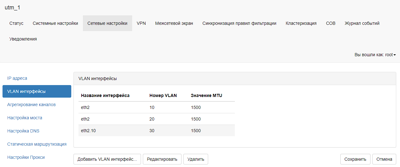 Для сохранения настроек необходимо нажать на кнопку «Сохранить». Для удаления двойной метки VLAN ID с VLAN интерфейса необходимо выбрать строку с номером VLAN ID, которую необходимо удалить, и нажать на кнопку «Удалить». Для сохранения настроек необходимо нажать на кнопку «Сохранить».