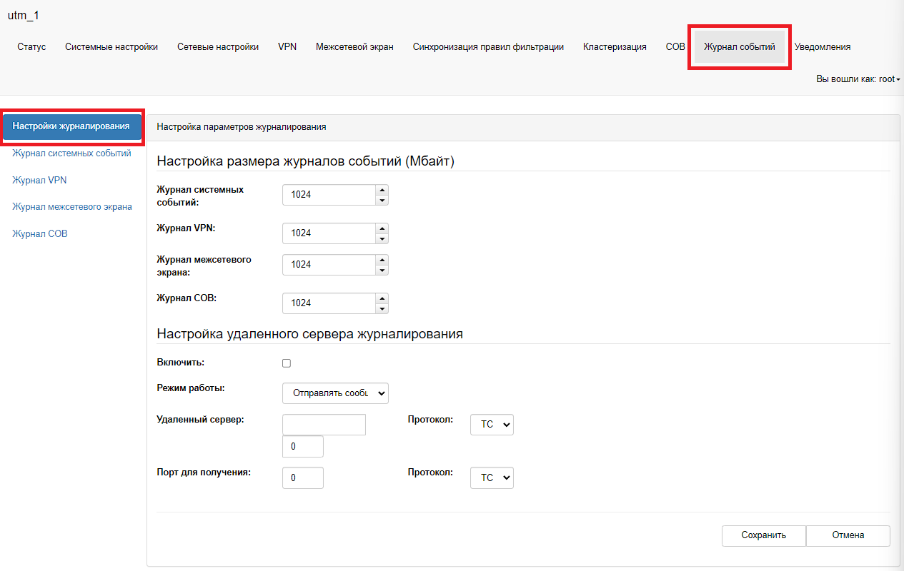 Для настройки отправки журналов событий на удаленный сервер необходимо в главном меню выбрать пункт «Журнал событий – Настройка журналирования». В таблице «Настройка параметров журналирования» необходимо установить флаг «Включить». В поле «Режим работы» необходимо выбрать один из режимов работы: «Отправлять сообщения», «Получать сообщения» и «Отправлять и получать сообщения». В поле «Удаленный сервер» необходимо задать ip-адрес удаленного сервера и номер сетевого порта, на который необходимо отправлять журнал событий. В поле «Протокол» необходимо выбрать протокол TCP или UDP. Для сохранения настроек необходимо нажать на кнопку «Сохранить».