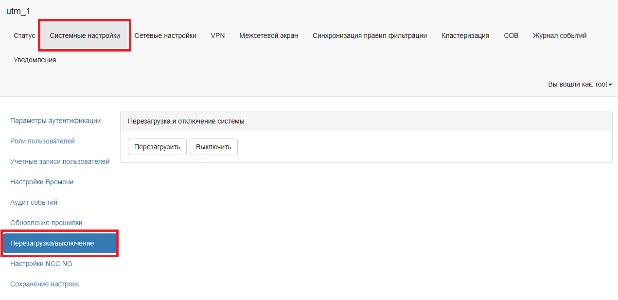 После успешной загрузки файла с прошивкой на устройство необходимо нажать на кнопку «Обновить». После успешного обновления прошивки необходимо перезагрузить устройство. Для перезагрузки устройства необходимо в главном меню выбрать пункт «Системные настройки – Перезагрузка/выключение». В таблице «Перезагрузка и отключение системы» необходимо нажать на кнопку «Перезагрузить».