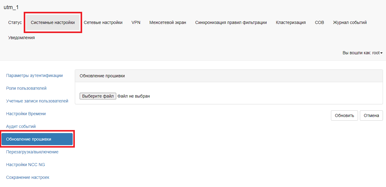 Для обновления прошивки необходимо в главном меню выбрать пункт «Системные настройки – Обновление прошивки». В таблице «Обновление прошивки» необходимо нажать на кнопку «Обзор» и в проводнике выбрать файл с прошивкой.