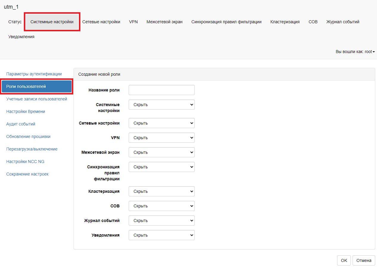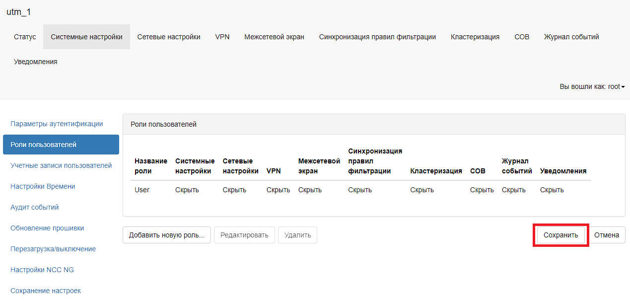 Для создания роли пользователя необходимо в главном меню выбрать пункт «Системные настройки – Роли пользователей». В таблице «Роли пользователей» необходимо нажать на кнопку «Добавить новую роль». В новом окне «Создание новой роли» в поле «Название роли» необходимо задать название новой роли пользователя, в поле «Системные настройки», «Сетевые настройки», «VPN», «Межсетевой экран», «Синхронизация правил фильтрации», «Кластеризация», «СОВ», «Журнал событий», «Уведомления» необходимо задать одно из значений и нажать на кнопку «ОК». Значение «Скрыть» скрывает от пользователя заданную вкладку с настройками, значение «Просмотр» позволяет пользователю просматривать настройки на заданной вкладке и значение «Правка» позволяет пользователю редактировать настройки на заданной вкладке. Для сохранения настроек необходимо нажать на кнопку «Сохранить».