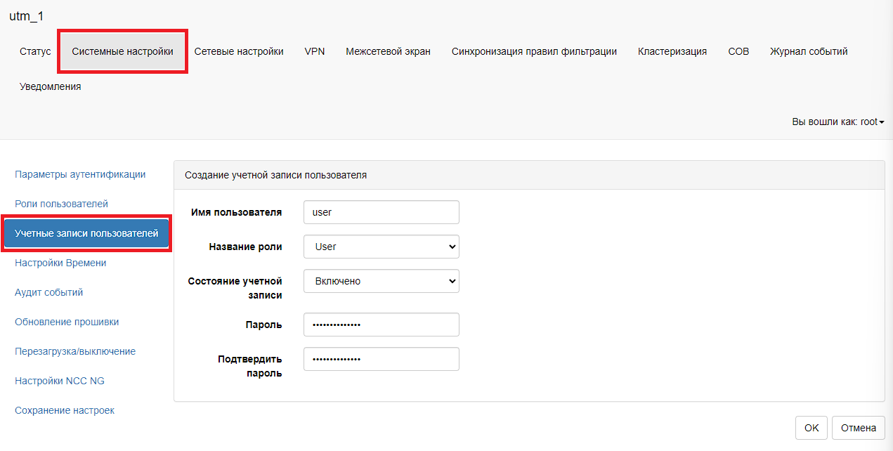Для создания учетной записи пользователя необходимо в главном меню выбрать пункт «Системные настройки – Учетные записи пользователей». В таблице «Учетные записи пользователей» необходимо нажать на кнопку «Добавить учетную запись». В новом окне «Создание учетной записи пользователя» в поле «Имя пользователя» необходимо задать имя нового пользователя, в поле «Название роли» необходимо выбрать одну из доступных ролей, в поле «Состояние учетной записи» необходимо выбрать состояние учетной записи, в поле «Пароль» необходимо задать пароль для учетной записи пользователя, который будет отвечать заданным параметрам аутентификации, в поле «Подтвердить пароль» необходимо еще раз ввести пароль для подтверждения и нажать на кнопку «ОК».