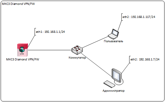 На рисунке представлена схема сети, на которой устройство МКСЗ Diamond VPN/FW, администратор сети и пользователи находятся в одном сегменте. Необходимо ограничить доступ к устройству МКСЗ Diamond VPN/FW по протоколу https и ssh для всех пользователей, кроме администратора.
