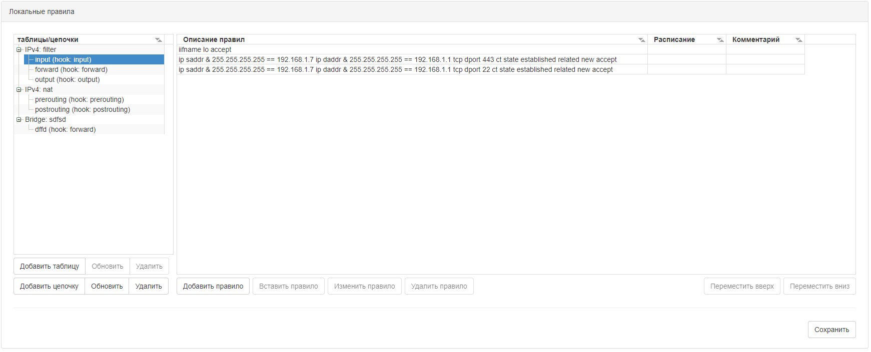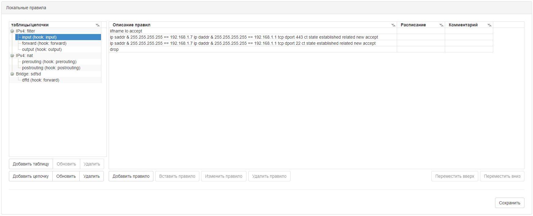 После создания правила фильтрации для системного интерфейса необходимо создать правило фильтрации для протокола https. Для настройки правила фильтрации для протокола https или ssh необходимо в главном меню выбрать пункт «Межсетевой экран». В таблице «Локальные правила» необходимо выбрать цепочку с правилами фильтрации для входящего трафика «input» и нажать на кнопку «Добавить правило».