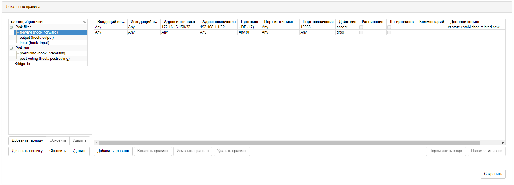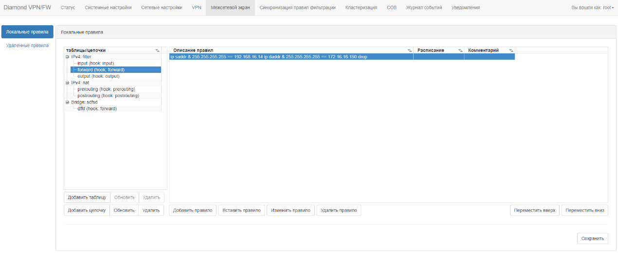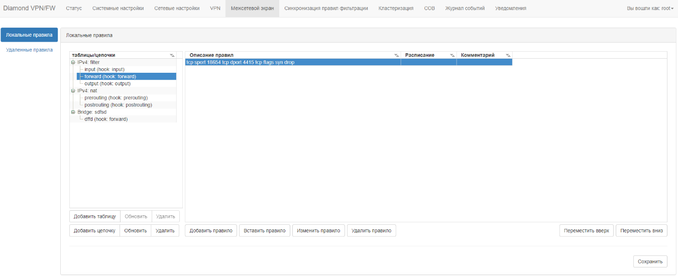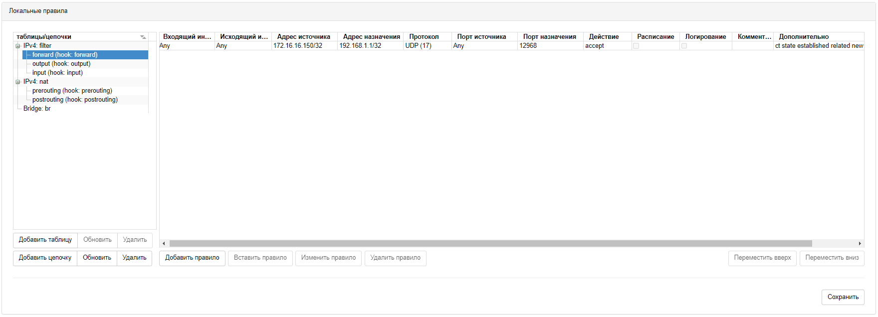 Для создания правила фильтрации необходимо в главном меню выбрать пункт «Межсетевой экран», в окне «Локальные правила» необходимо выбрать цепочку «Forward».