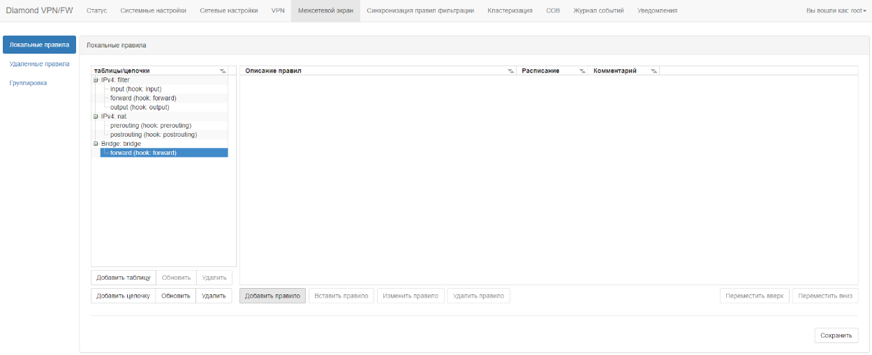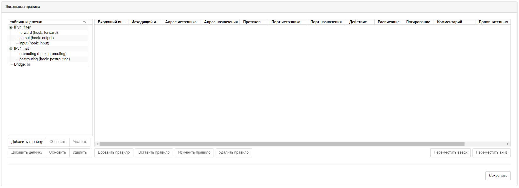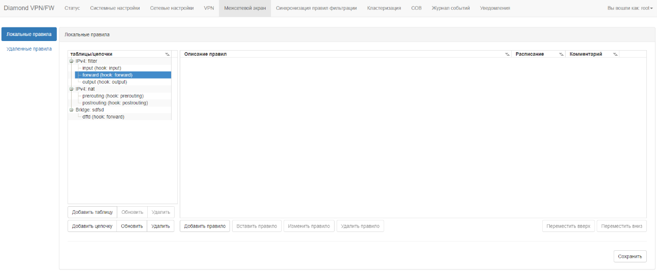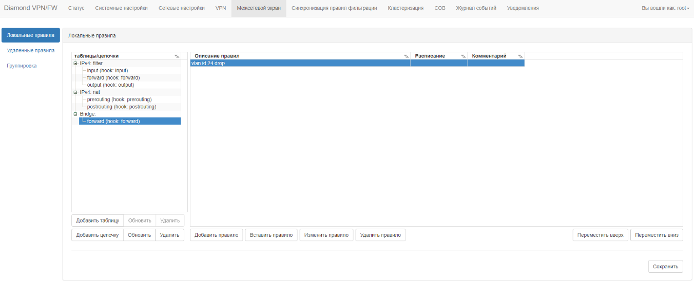 Для создания правила фильтрации необходимо в главном меню выбрать пункт «Межсетевой экран», в окне «Локальные правила» необходимо выбрать цепочку «Forward».