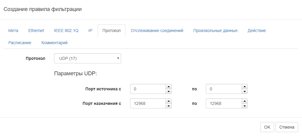 На вкладке «Протокол» в поле «Протокол» необходимо выбрать протокол UDP, в поле «Порт назначения» необходимо задать сетевой порт 12968.
