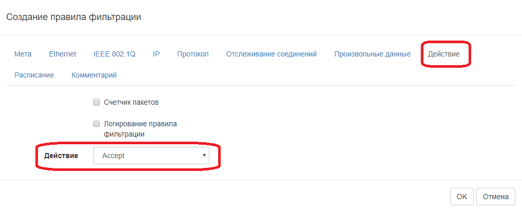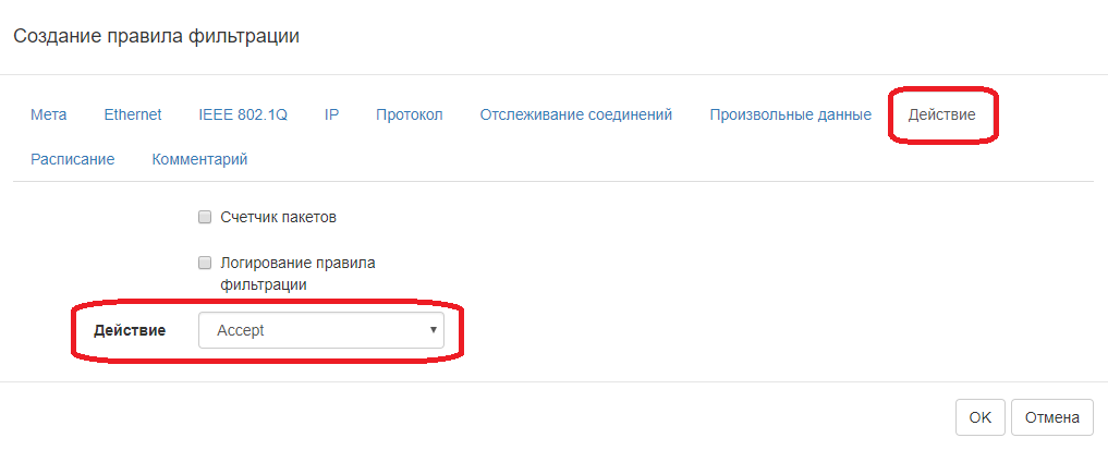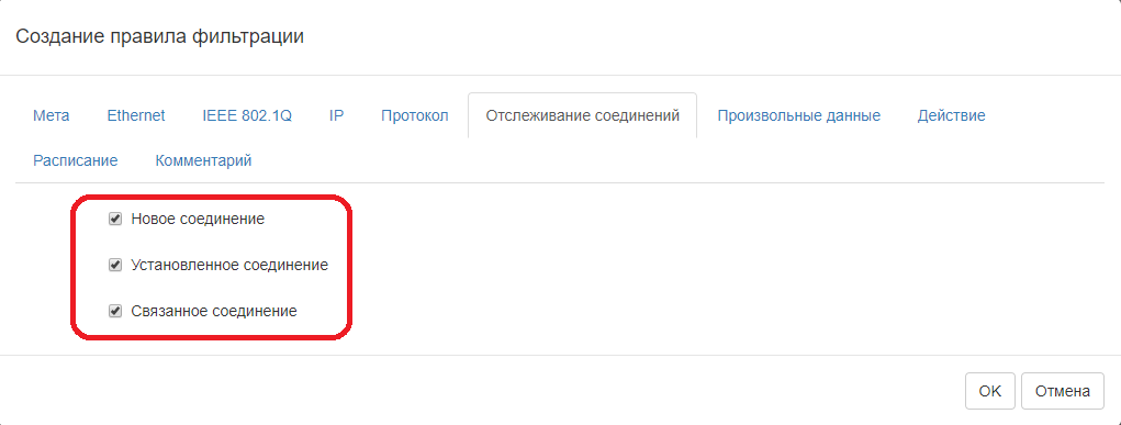 На вкладке «Отслеживание соединений» необходимо установить флаг «Новое соединение», «Установленное соединение» и «Связанное соединение». На вкладке «Действие» в поле «Действие» необходимо выбрать действие «Accept». После задания всех параметров необходимо нажать на кнопку «ОК», для сохранения настроек необходимо нажать на кнопку «Сохранить».