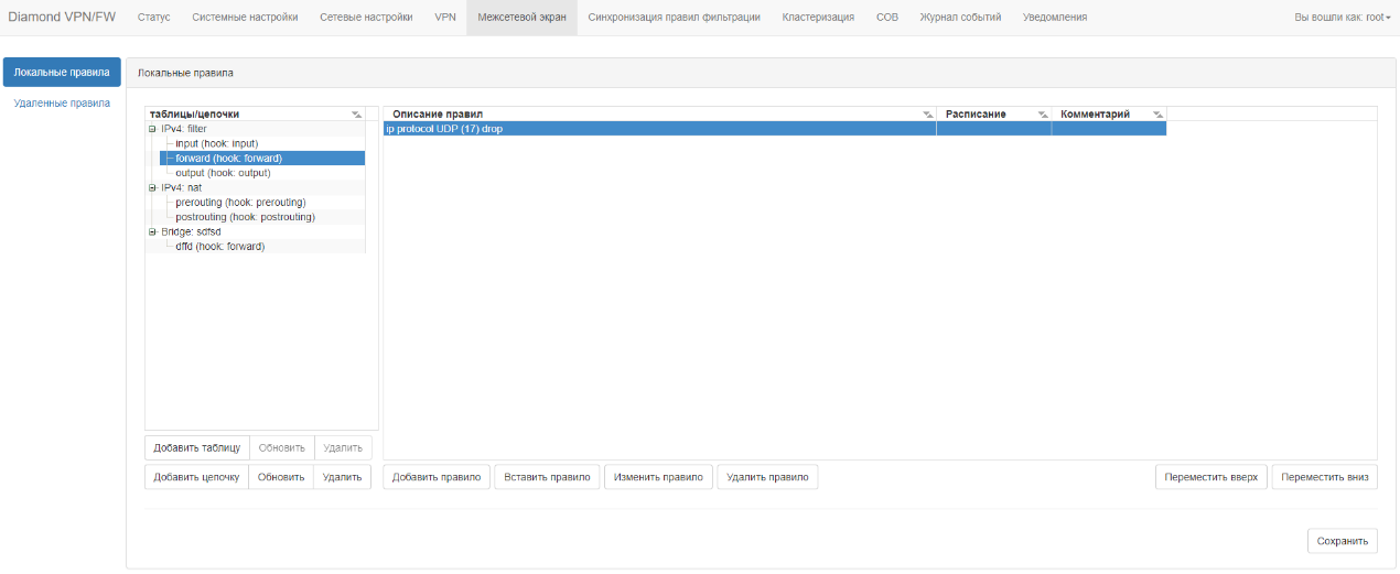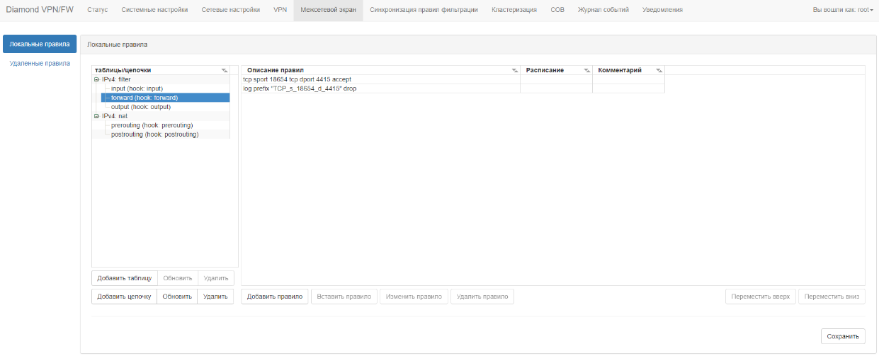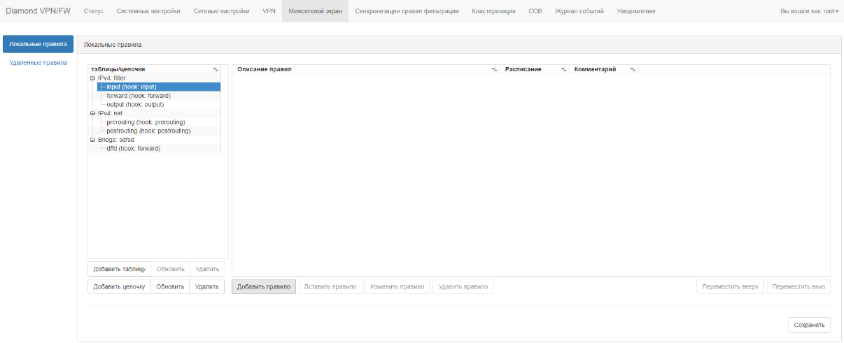 Diamond VPN/FW позволяет сохранить конфиг правил межсетевого экрана. Сделать это можно с помощью команды: nft -s list ruleset » /etc/nftables.conf Эти правила межсетевого экрана сохранятся в файл nftables.conf
