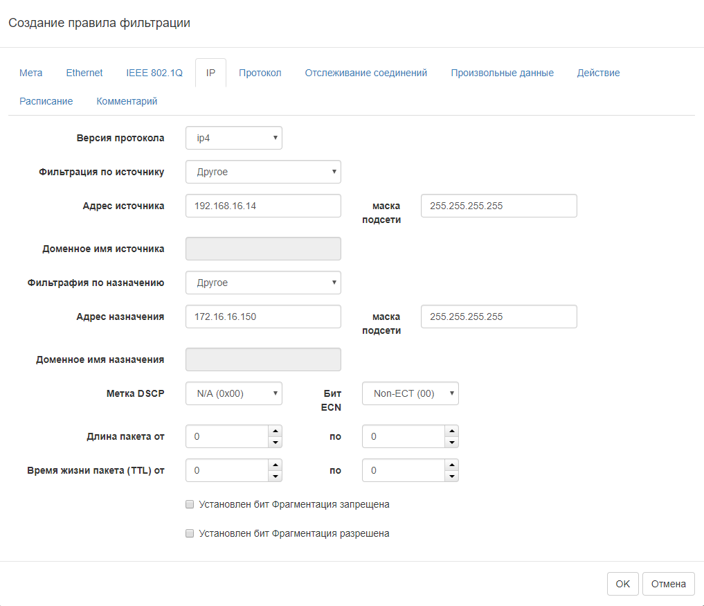 В новом окне «Создание правила фильтрации» на вкладке «IP» в поле «Адрес источника» необходимо задать ip-адрес 172.16.16.150, в поле маска подсети необходимо задать маску подсети 255.255.255.255, в поле «Адрес назначения» необходимо задать ip-адрес 192.168.1.1, в поле маска подсети необходимо задать маску подсети 255.255.255.255.