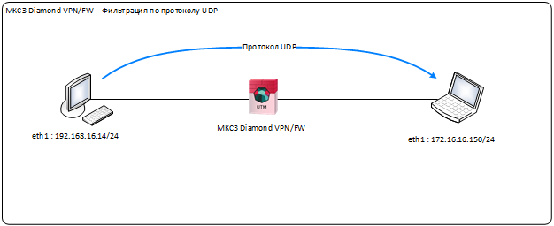С помощью настроек необходимо реализовать сценарий, по которому на устройстве МКСЗ Diamond VPN/FW будет настроено запрещающее правило фильтрации для протокола UDP.