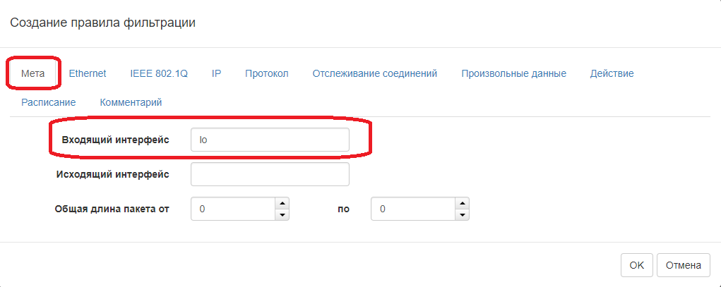 В новом окне «Создание правила фильтрации» на вкладке «Мета» в поле «Входящий интерфейс» необходимо задать системный интерфейс «l0».