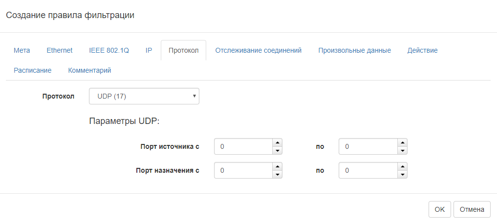 Для добавления правила фильтрации необходимо нажать на кнопку «Добавить правило». В новом окне на вкладе «Протокол» в поле «Протокол» необходимо выбрать протокол UDP. При выборе типа протокола будут доступны дополнительные опции, которые поддерживает протокол. Для протокола UDP доступны следующие опции: сетевой порт источника и сетевой порт назначения. На вкладке «Действие» в поле «Действие» необходимо выбрать действие «Drop». Чтобы проверить работу правила фильтрации можно использовать опцию «Счетчик пакетов» и «Логирование правила фильтрации». После задания всех полей необходимо нажать на кнопку «ОК», для сохранения правила фильтрации необходимо нажать на кнопку «Сохранить». Данное правило фильтрации запрещает сетевой трафик по протоколу UDP.