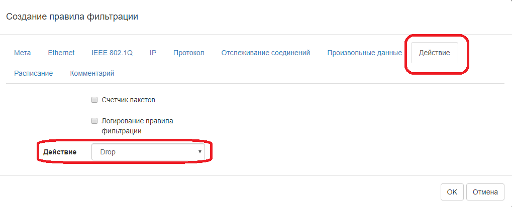 Чтобы проверить работу правила фильтрации можно использовать опцию «Счетчик пакетов» и «Логирование правила фильтрации». После задания всех полей необходимо нажать на кнопку «ОК», для сохранения правила фильтрации необходимо нажать на кнопку «Сохранить».