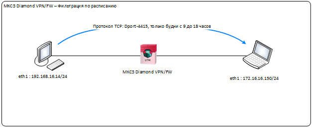 С помощью настроек необходимо реализовать сценарий, по которому на устройстве МКСЗ Diamond VPN/FW будет настроено правило фильтрации, которое запрещает трафик для протокола TCP на порт 80 с ip-адресом 192.168.16.14/24 к устройству с ip-адресом 172.16.16.150/24 c 9 до 18 часов по будням.